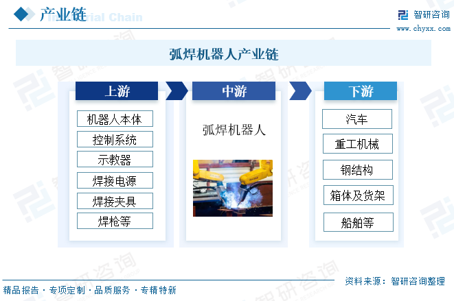 从产业链来看,上游为生产弧焊机器人所需的零部件及原材料,弧焊机器人系统基本组成包括机器人本体、控制系统、示教器、焊接电源、焊枪、焊接夹具、安全防护设施。系统组成还可根据焊接方法的不同以及具体待焊工件焊接工艺要求的不同等情况,选择性扩展以下装置:送丝机、清枪剪丝装置、冷却水箱、焊剂输送和回收装置(SAW时)、移动装置、焊接变位机、传感装置、除尘装置等。中游为弧焊机器人生产制造。下游为弧焊机器人应用领域,弧焊机器人可用于手工焊接难以完成的复杂曲线焊接,广泛应用于汽车、造船和钢结构等领域。