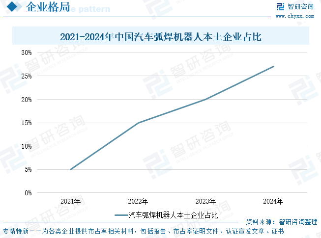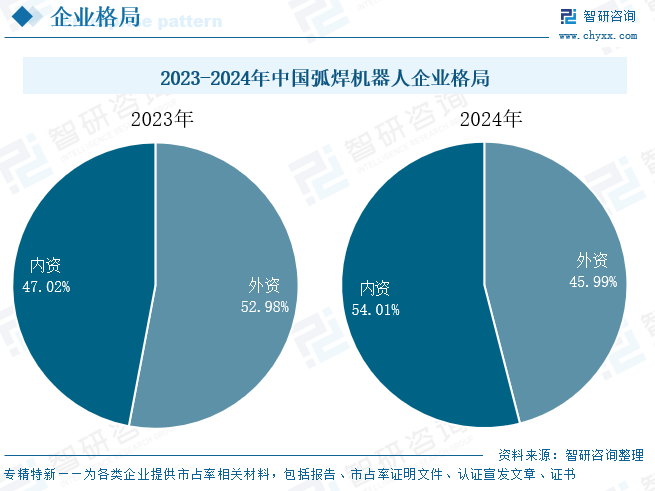 我国在弧焊机器人领域起步较晚,基础较为薄弱,以安川、发那科为代表的日系企业与以KUKA、ABB为代表的欧系企业凭借雄厚的技术实力、资金实力与强大的品牌影响力,占据我国弧焊机器人主导地位。但近年来,在国产替代战略背景下,本土企业不断加大研发投入,提升自主创新能力,在机器人核心技术领域实现了重大突破,市场份额不断提升,国产化替代加速推进。到2024年,本土企业市场份额首次超过外资企业,达54.01%,同比提升6.99个百分点。但整体来看,国产弧焊机器人在产品性能、技术水平等方面较国际品牌仍有较大差距,外资企业在高端市场竞争优势明显,仍占据主导地位。