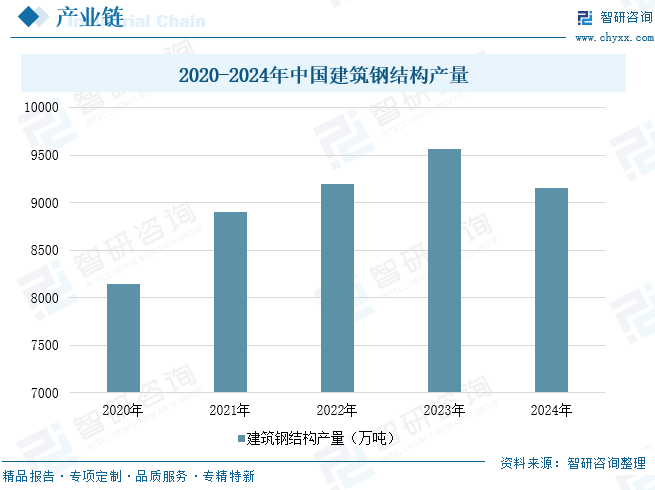 钢结构凭借高强度、轻质量、施工速度快、可回收利用等优势,在超高层建筑、文化体育场馆、交通基础设施等领域广泛应用。数据显示,2024年全国钢结构产量9148万吨,同比下降4.3%,占粗钢产量9.1%,在建筑业新开工程项目和新建建筑面积持续下降趋势下,钢结构作为建筑主体工程中的重要组成部分,钢结构产量总体保持平稳,部分在建钢结构工程由于资金拖欠,进度放缓,导致对钢结构构件生产、制造产量略有回落。从钢结构行业的整个生产工作量上来看,焊接工艺的占比较重,依赖于焊工操作。但随着人口红利减退,以及焊接环境的恶劣,钢结构企业招工变得越发艰难。因此,焊接环节用机器换人已成为当前钢结构企业的选择之一。对其而言,焊接机器人除了能缓解焊工难求的局面外,还能稳定焊接的质量,提高生产效率。