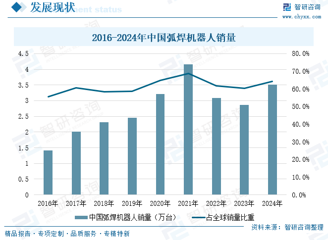 中国是全球最大的弧焊机器人市场,2024年受益于下游应用领域需求的释放,如汽车、钢构、船舶等,中国弧焊机器人市场销量同比增长22.73%,达3.51万台,占全球总销量的64.4%,同比提升4.1个百分点。同时,信息技术不断突破为弧焊机器人行业发展带来更多可能性,智能弧焊机器人渗透率持续提升。