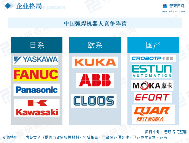 行业广阔的发展前景吸引了大量企业加入,弧焊机器人市场参与者较多,整体来看,参与者可分为日系、欧系、国产三大派别,日系品牌主要有安川、发那科、OTC、松下、川崎重工等;欧系品牌包括KUKA、Cloos和ABB等;国产品牌主要有卡诺普、埃斯顿、藦卡机器人、埃夫特、钱江机器人、凯尔达、新松机器人、配天机器人、新时达、柴孚机器人等。