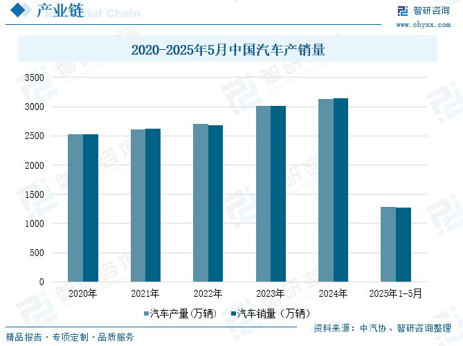 改革开放以来,中国汽车产业迅速发展,产销规模不断扩大,逐渐成为国民经济支柱产业之一,2018-2020年受经济增速放缓及政策调整影响产销量承压,2021-2024年伴随经济复苏、新能源汽车爆发及政策刺激,实现连续四年增长。2024年,我国汽车产销分别完成3128.2万辆和3143.6万辆,同比分别增长3.7%和4.5%,汽车产销总量连续16年稳居全球第一。2025年1-5月,汽车产销分别完成1282.6万辆和1274.8万辆,同比分别增长12.7%和10.9%。其中新能源汽车产销分别完成569.9万辆和560.8万辆,同比分别增长45.2%和44%。