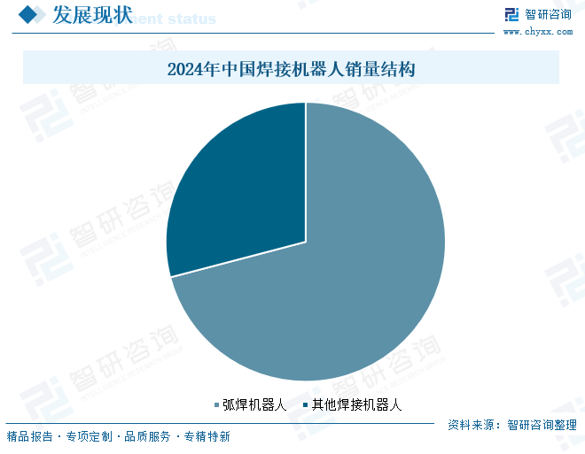 一直以来,焊接作为制造业中的关键工艺,其质量与效率直接关乎产品的整体性能与生产效益。中国作为世界上重要的工业制造大国,对于焊接机器人的需求和依赖尤为强烈。2024年中国市场焊接机器人销量4.95万台,同比增长6.39%。焊接机器人产品种类日益丰富,形成点焊机器人、弧焊机器人、激光焊机器人等多种类型,其中弧焊机器人占据主导地位,2024年市场占比70.9%。