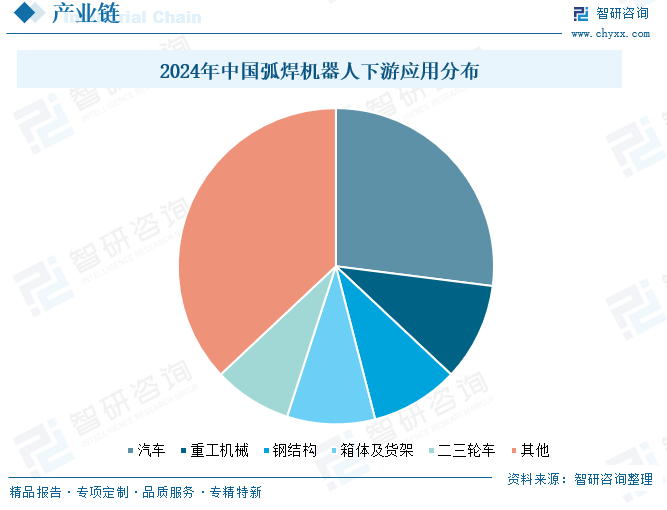 弧焊机器人具有高效率、高精度、一致性等优点,被广泛用于汽车、重工机械、钢结构、箱体及货架、船舶等领域,在制造业中的重要性不断提升。汽车是弧焊机器人最大应用市场,2024年占比27%。其次为重工机械,占比10%左右。