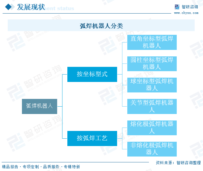 弧焊机器人是使用电弧作为热源进行焊接的设备,适用于焊接钢材、不锈钢和铝合金等材料。根据国家标准《弧焊机器人 通用技术条件(GB/T 20723-2006)》,弧焊机器人按坐标型式可分为直角坐标型弧焊机器人、圆柱坐标型弧焊机器人、球坐标型弧焊机器人、关节型弧焊机器人;按弧焊工艺可分为熔化极弧焊机器人、非熔化极弧焊机器人。