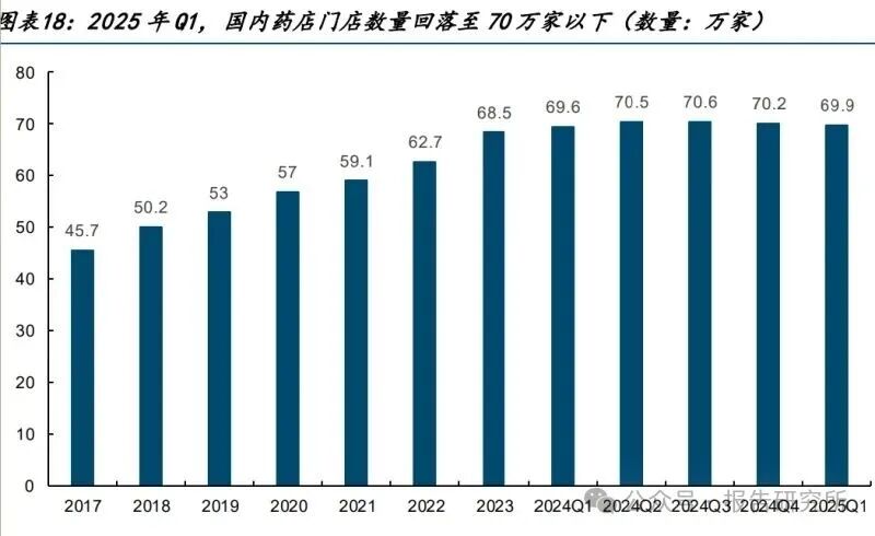 根据中康药店通数据,2025 年 Q1,全国新开药店 7118 家,闭店 10284 家,净减少约 3000 家,门店数回落至 70 万以下。2024 年 Q4 至 2025 年 Q1,药店行业连续两个季度处于“净 关店”状态。我们认为,在药品追溯码持续落地、医保资质授予趋严的情况下,国内药店 门店数量有望进一步减少,竞争格局有望优化。