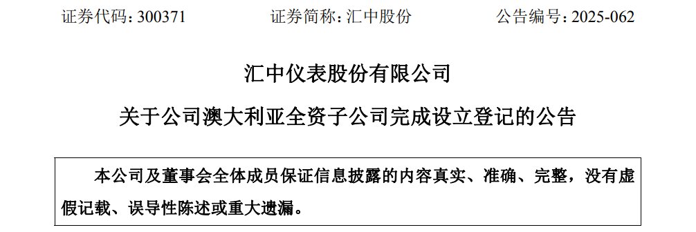 近日,汇中仪表股份有限公司(简称:汇中股份)发布公告称,汇中股份拟使用自有资金对外投资设立澳大利亚全资子公司,投资金额不超过 2,000 万元人民币或等值外币。