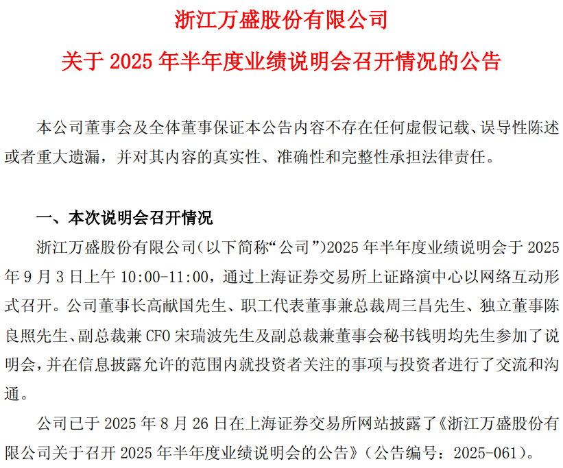 9月3日,万盛股份召开2025年半年度业绩说明会。公司董事长高献国、总裁周三昌等核心管理层出席,并就投资者关注的业绩波动、战略布局、研发进展等热点问题一一作出回应。