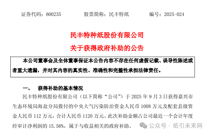 民丰特纸9月3日晚间公告,公司当日收到嘉兴市生态环境局海盐分局拨付的中央大气污染防治资金1008万元及配套县级资金112万元,合计获得政府补助1120万元。该补助金额占公司最近一个会计年度经审计净利润的15.56%,依据《企业会计准则》相关规定,确认为与收益相关的政府补助。