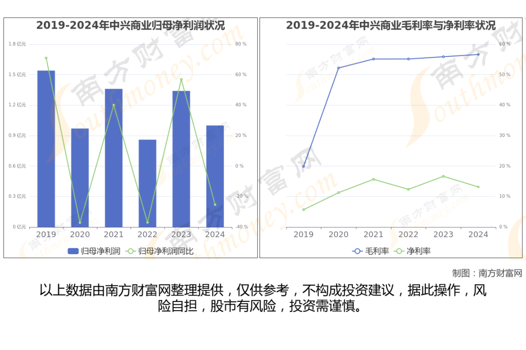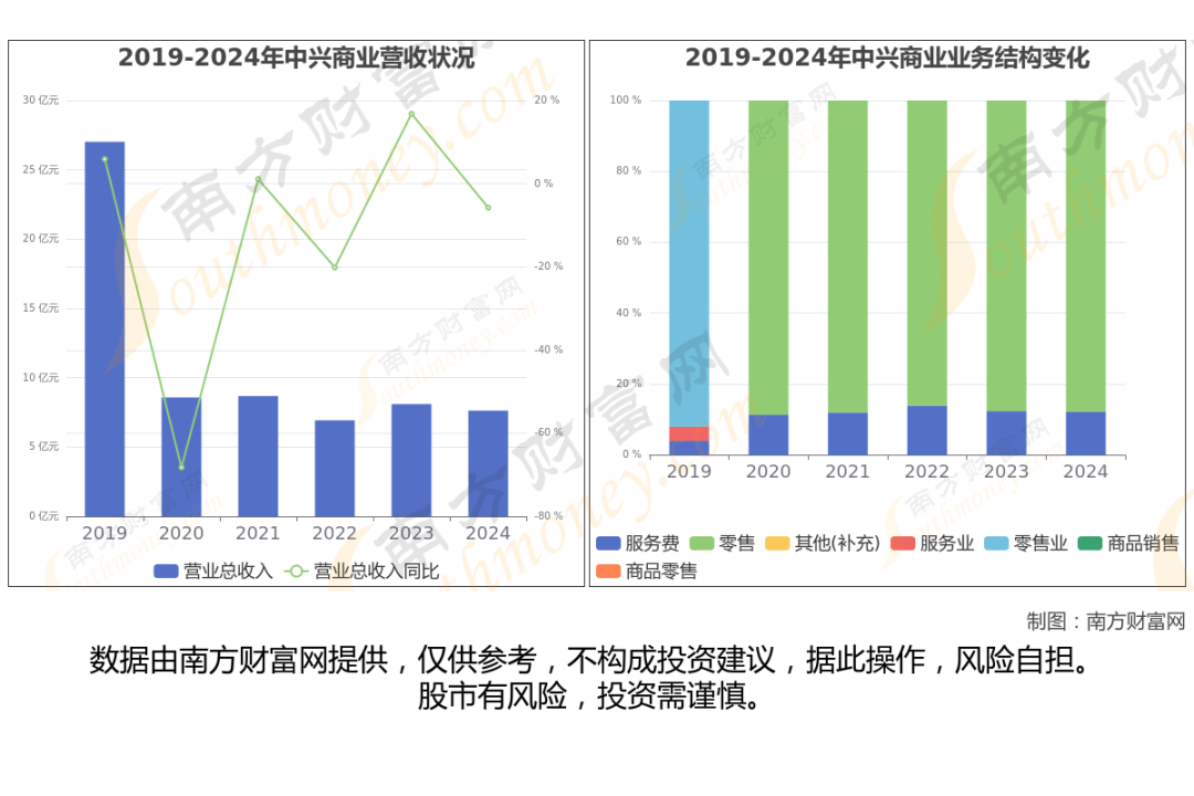 中兴商业财务数据显示(如上图): 2024年实现营业总收入 7.63亿,同比增长-5.76%。近五年复合增长率(CAGR)为-2.89%。