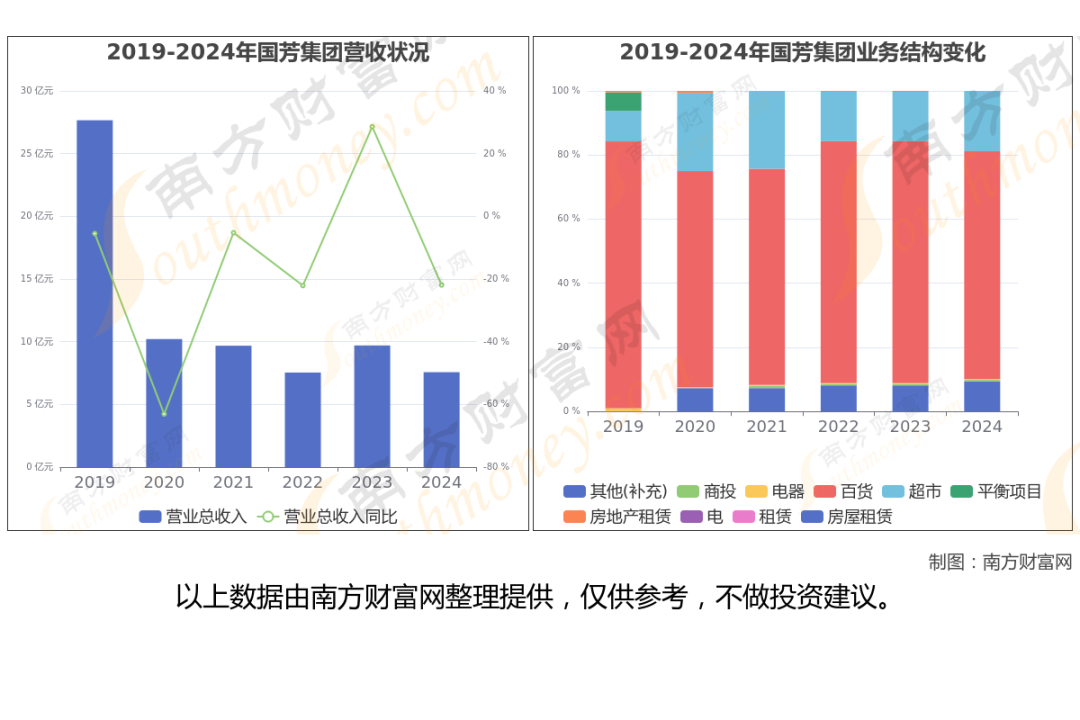 据国芳集团2024年全年业绩显示(如上图),公司营业收入为7.57亿,同比增长-21.92%,近5年复合年增长率-7.21%。