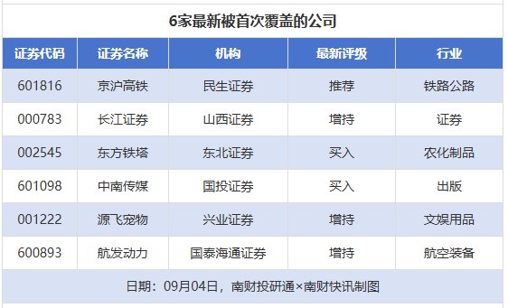 首次覆盖方面,9月4日券商共给出了6次首次覆盖,其中京沪高铁获得民生证券给予“推荐”评级,长江证券获得山西证券给予“增持”评级,东方铁塔获得东北证券给予“买入”评级,中南传媒获得国投证券给予“买入”评级,源飞宠物获得兴业证券给予“增持”评级。