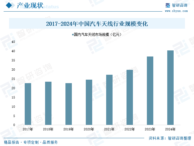 智能网联化趋势让汽车成为新的移动终端,智能化、网联化成为新型汽车必备的要素。而根据市场调查情况显示,传统燃油车平均搭载3-4根天线,而具备L2+级自动驾驶功能的车型需要6-8根天线。这意味着,汽车无线技术在整个车辆智能化产业链中扮演着至关重要的角色,汽车智能化发展趋势正不断为汽车天线行业发展注入活力,叠加新能源汽车渗透率日益提升,我国汽车无线市场迎来巨大发展机遇。数据显示,2024年我国汽车天线市场规模已从2017年的22.67亿元增长至40.33亿元。