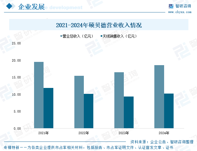 惠州硕贝德无线科技股份有限公司成立于2004年2月,2012年在深圳证券交易所创业板挂牌上市,股票简称“硕贝德”。硕贝德是一家专业从事移动通信行业,以无线射频技术为核心,集研发、制造与销售为一体的国家级高新技术企业,已掌握了5G终端天线、5G射频前端模组、5G基站天线、LCP传输线及天线、高集成多合一鲨鱼鳍5G天线和多线圈无线充电发射端等生产制造技术,公司主营产品包括有移动智能终端天线、车载智能天线、无线充电产品、指纹及传感器模组、通讯基站类产品、高效能热传导产品、新能源动力电池结构组件及配套智能检测治具与装备等。数据显示,2024年,硕贝德营业总收入为18.57亿元,同比增长12.37%;其中,天线销售收入为10.24亿元,同比增长8.93%。