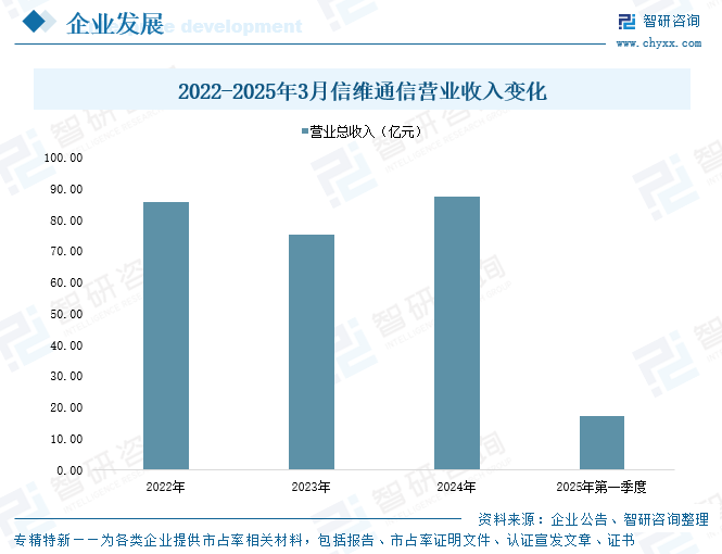 深圳市信维通信股份有限公司成立于2006年4月27日,2010年11月5日在深圳证券交易所创业板上市,股票简称“信维通信”。信维通信主营业务包括天线及模组、无线充电模组及相关产品、EMI\EMC 器件、高精密连接器、声学器件、汽车互联产品、被动元件等,客户涵盖全球知名科技企业,应用领域包括消费电子(智能手机、个人电脑、智能穿戴设备等)、汽车、物联网/智能家居、卫星通信、数据中心、绿色储能等。数据显示,2024年、2025年第一季度,信维通信营业收入分别为87.44亿元、17.43亿元,同比变化率分别为15.85%、-6.19%。