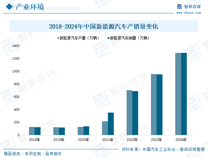 随着全球能源短缺和环境保护问题日益凸显,节能环保问题逐渐引起各国的重视。传统燃油汽车作为主要的能源消耗源和污染排放源,未来将被新能源汽车代替已经形成共识。为了应对能源与环保问题,各国纷纷发布汽车电动化并跟进发布补贴政策以推广新能源汽车。我国更是将新能源汽车作为推动绿色产业发展和升级、实现汽车强国战略而大力扶持。根据中国汽车工业协会统计,2024年我国新能源汽车销售数量为1286.6万辆,同比增长35.5%,2020年至2024年国内新能源汽车销量的复合增长率高达76.59%。