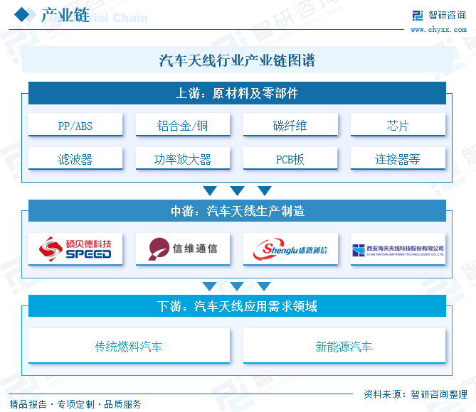 汽车天线行业产业链上游为原材料及零部件供应环节,主要包括PP/ABS、铝合金/铜、碳纤维、芯片、滤波器、功率放大器(PA)、PCB板(高频覆铜板)、连接器、同轴线缆等。产业链中游为汽车天线生产制造环节,代表生产商有盛路通信、信维通信、北斗星通、硕贝德等。产业链下游为汽车天线应用需求领域,即汽车整车制造产业,主要包括传统燃料汽车和新能源汽车两大领域。