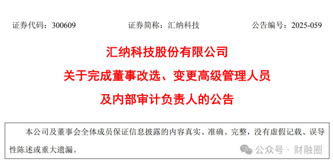 2025年9月2日,深交所创业板上市公司汇纳科技(300609.SZ)发布了《关于完成董事改选、变更高级管理人员及内部审计负责人的公告》。公告显示,因工作调整原因,孙卫民先生申请辞去公司总经理、财务总监职务。孙卫民先生辞去上述职务后仍然担任公司非独立董事,以及公司及控股子公司其他职务。孙卫民先生的原定任期至2026年5月15日,截至本公告披露日,孙卫民先生不存在应当履行而未履行的承诺事项。截至本公告披露日,孙卫民先生持有公司股份201,174股(按照汇纳科技9月4日收盘价46.65元/股计算,孙卫民先生持股市值约为938万元)。