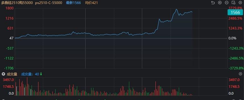 9月5日14点10分,多晶硅上涨8.77%,多晶硅2510购55000期权大涨2985.11%,价格从47.0涨至最新价1450。