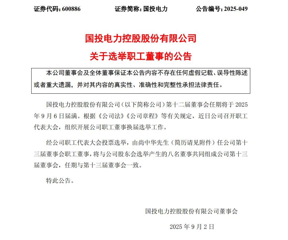 9月2日,国投电力(600886)公告称,公司第十二届董事会任期将于2025年9月6日届满。根据《公司法》《公司章程》等有关规定,近日公司召开职工代表大会,组织开展公司职工董事换届选举工作。