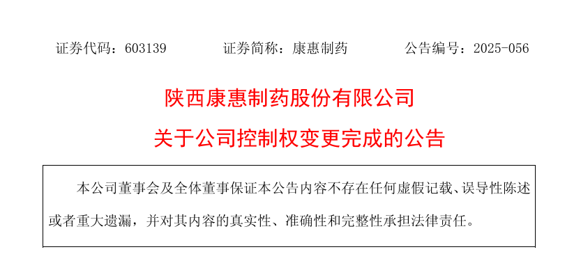 近日,陕西康惠制药(维权)股份有限公司发布公告,公司控制权变更已完成,公司控股股东变更为悦合智创,实际控制人变更为李红明、王雪芳夫妇。