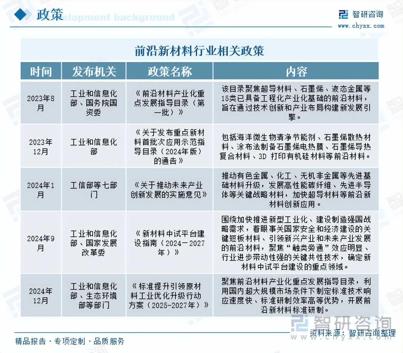 注:本文节选出自智研咨询发布的《研判2025!中国前沿新材料行业政策汇总、产业链、市场规模、细分市场、企业分析及发展趋势分析:政策需求双轮驱动,市场规模突破3000亿元[图]》行业分析文章,如需获取行业文章全部内容,可进入智研咨询搜索查看。
