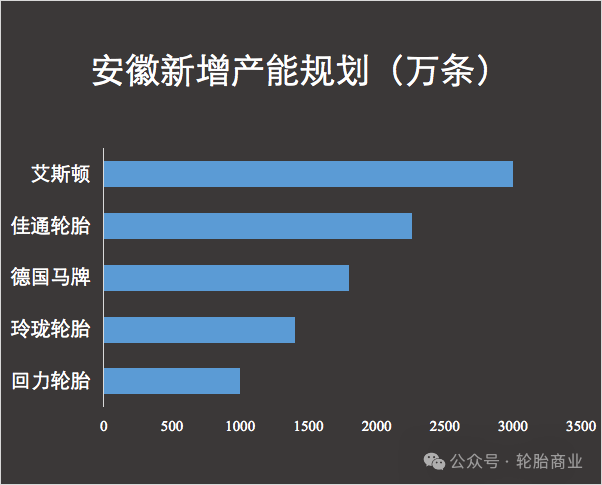 自2022年以来,安徽就以其汽车制造业优势吸引了不少中国轮胎企业在此建厂争夺配套资源。如果算上2024年已投产项目,预计到2027年底安徽规模以上在建和新投产的轮胎产能已经超过了9400万条。