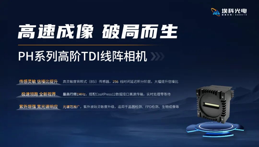 高速高分辨率线阵相机作为埃科光电的王牌产品,新品PH系列8K相机以1MHz行频开启高速检测新时代,背照式传感器灵敏度高,读出噪声低至5.9e-,支持最高256线TDI,在明暗场检测环境中,通过灵活设置TDI阶数,以保留更多成像细节,可用于无图晶圆外观检测、有图晶圆外观检测等。