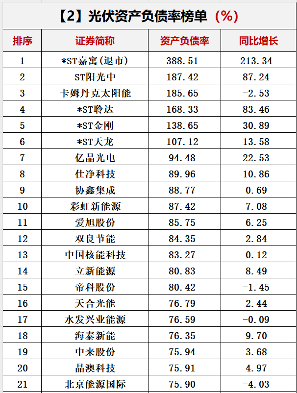 而截止2025年6月末,有37家企业资产负债率超过70%,15家企业超过80%,6家企业超过100%(资不抵债),依次为*ST嘉寓(已退市)、*ST聆达(维权)、ST阳光中、卡姆丹克太阳能、*ST金刚、*ST天龙。以下表格包含三个榜单,总负债排行、资产负债率排行和有息负债排行: