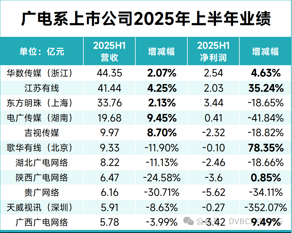 2025年上半年的业绩答卷,清晰地展现了广电系上市公司在转型升级过程中的分化态势。江苏有线、华数传媒、电广传媒等企业通过积极布局5G融合业务、拓展政企市场和创新业态,展现出较强的应变能力与发展韧性,为行业提供了可借鉴的转型路径。