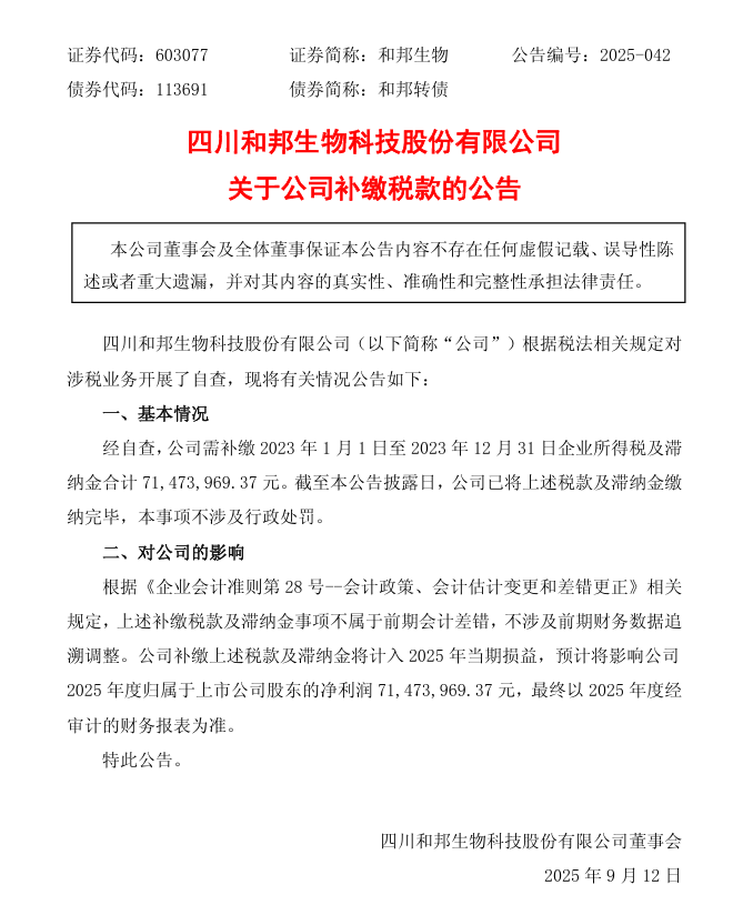 9月11日晚间,和邦生物发布公告称,经自查,公司需补缴2023年1月1日至2023年12月31日企业所得税及滞纳金合计71,473,969.37元。截至本公告披露日,公司已将上述税款及滞纳金缴纳完毕,本事项不涉及行政处罚。