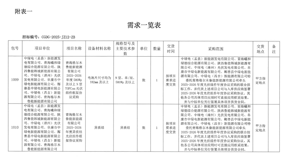 采购范围:中绿电(盂县)新能源发电有限公司、青海曦和绿德综合能源有限公司、陕西鲁能韩城新能源有限公司、中绿电(漳州)光伏发电有限公司、阜康市中绿电新能源有限公司、鄯善县中绿电新能源有限公司、中绿电(昌吉)新能源有限公司特委托青海格尔木鲁能新能源有限公司牵头2025-2026年度光伏组件年度协议采购的联合招标工作,并代表上述项目公司与入库供应商签署2025-2026年度光伏组件年度协议采购协议。其他各公司具体项目应用时可直接应用框采结果,并与中标单位另行签署具体项目供货合同。
