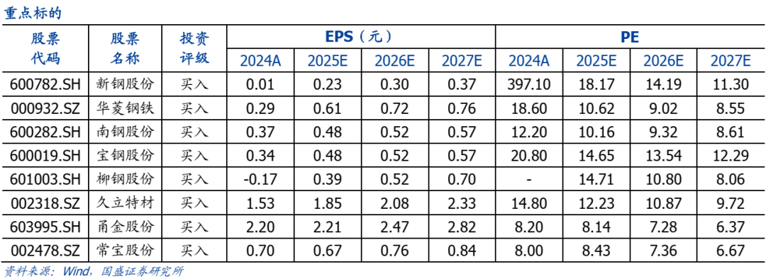 后市研判:下半年随着出口经常项目顺差和去年财政后置发力抬高的同比基数,经济增速较之前可能会有所下降。缓解的措施包括存量政策的执行,如上半年宣布的政策性金融工具和房地产收储政策,还有一些储备的政策,整体经济大概率依然处于稳定可控的状态。我们对钢铁行业盈利的关注点更多聚焦供给结构调整。9月16日出版的第18期《求是》杂志将发表中共中央总书记、国家主席、中央军委主席习近平的重要文章《纵深推进全国统一大市场建设》。文章指出,要聚焦重点难点,下决心清除顽瘴痼疾。第一,着力整治企业低价无序竞争乱象。“内卷”重灾区,要依法依规有效治理。更好发挥行业协会自律作用,引导企业提升产品品质。推动落后产能有序退出。第二,着力整治政府采购招标乱象。重点整治最低价中标、以次充好、利益勾连等突出问题。规范政府采购和招标投标,加强对中标结果的公平性审查。第三,着力整治地方招商引资乱象。要制定全国统一的地方招商引资行为清单,明确鼓励和禁止的具体行为。加强招商引资信息披露。第四,着力推动内外贸一体化发展。畅通出口转内销路径,提高国内国际标准一致性,培育一批内外贸优质企业。第五,着力补齐法规制度短板。持续开展规范涉企执法专项行动。健全有利于市场统一的财税体制、统计核算制度和信用体系。第六,着力纠治政绩观偏差。完善高质量发展考核体系和干部政绩考核评价体系。我们在之前的深度报告中论述过当钢铁行业进入成熟期需求侧周期波动下降后,行业周期波动更加依赖于供给端的变化。而供给端的变化既可以通过市场化的资本回报周期的轮回,也可以由政府通过看得见的手进行组织协同。重工业资产属性决定了沉没成本很大,资本退出困难。如果通过看不见的手消化调整代价巨大,用时是缓慢的,而看得见的手可以加速这一均值回归的过程。对于“反内卷”政策市场可能高估了短期的影响,而忽视了长期方向性作用。我们期待后期中央政府加大力度破除地方保护,让钢厂反内卷政策能尽快切实转化为行动上的压产。我们在此前深度报告以重置价值测算行业部分公司处于价值低估区,具备非常强的安全边际。行业未来存在修复的机会(详见国盛证券华菱钢铁深度报告、南钢股份深度报告、宝钢股份深度报告、新钢股份深度报告)。我们继续推荐底部估值区域的华菱钢铁、南钢股份、宝钢股份、新钢股份,受益于油气、核电景气周期的久立特材,受益于管网改造及普钢盈利弹性的新兴铸管,受益于煤电新建及油气景气周期的常宝股份,以及受益于需求复苏和镀镍钢壳业务的甬金股份,建议关注受益于煤电新建及进口替代趋势的武进不锈。