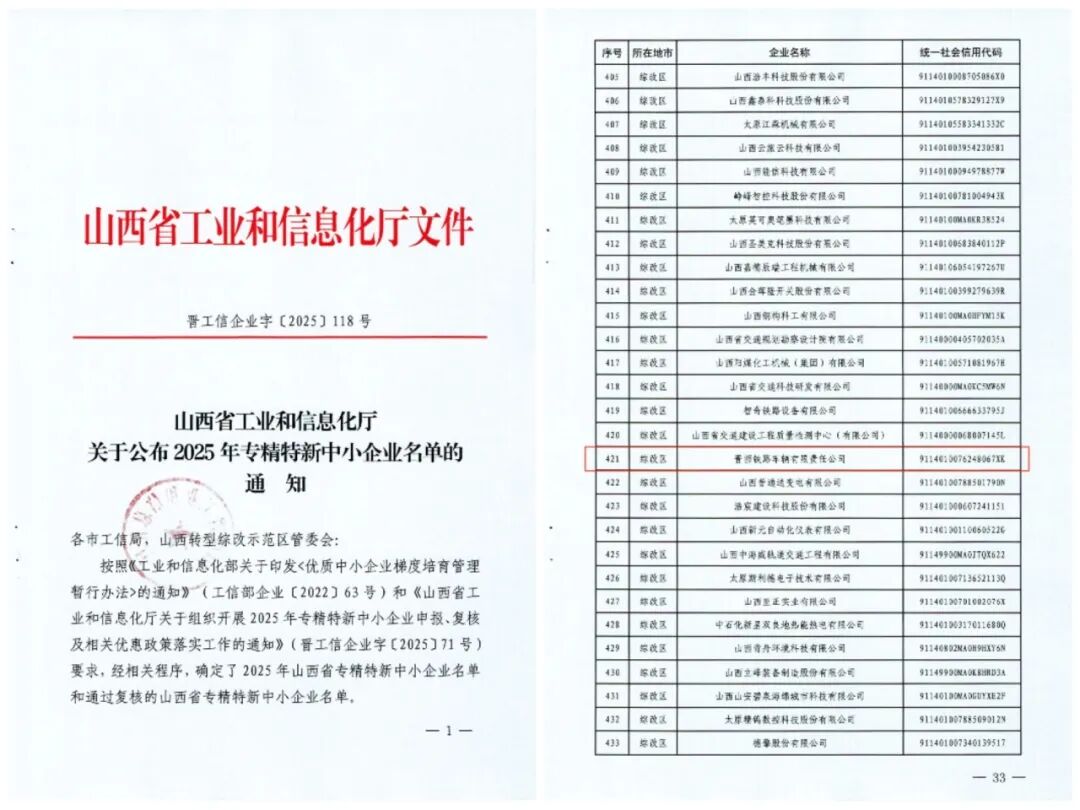 近日,山西省工业和信息化厅公布了新一批山西省“专精特新中小企业”复核名单,晋西铁路车辆有限责任公司(以下简称“晋西车辆”)凭借其在轨道交通装备制造领域深厚的技术积累、持续的创新能力和突出的市场表现,成功通过复核,再次获评山西省“专精特新中小企业”。