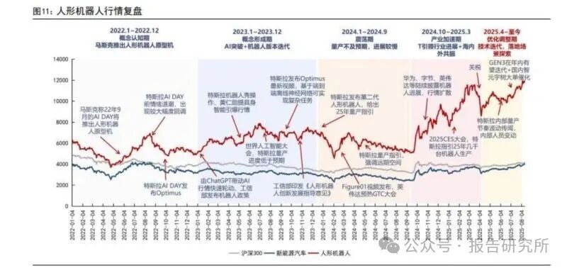 自特斯拉展示 Optimus 样机以来,大模型迭代+国内外共振+政策支持带来机器人行情的持续,机器人 产业化进展持续推进,当前人形机器人板块呈现几大趋势强化:1)巨头入局:特斯拉(Optimus)、英 伟达(GR00T)、华为(具身智能中心)、字节(豆包机器人)等科技龙头加速布局,2025 年或形成 技术共振;2)新秀涌入:初创企业(Figure、1X)与车企(小米、小鹏、赛力斯等)双向发力,产品 迭代提速;3)国产崛起:宇树(H1 双足机器人)、智元(远征 A2)等技术突破带动国产认知度提升, 2025 年或迎量产关键节点。下面对板块行情复盘: 阶段一(22.1-22.12)概念认知期:继特斯拉提出人形机器人设计概念后带动板块,市场开始寻找机器 人相关布局,处于概念萌发阶段。 阶段二(23.1-23.12)板块形成期:机器人受益于 AI 大模型能力的提升,同时特斯拉持续迭代新版本 (新视频),机器人概念逐步确立并加强。 阶段三(24.1-24.9)震荡期:特斯拉量产节奏缓慢影响行情景气度,2024 年 1 月特斯拉给出 2025 年 实现量产的指引,低于市场预期,整体行情承压。 阶段四(24.10-25.3)产业加速期:特斯拉量产节奏明确,AI 模型能力持续赋能,政府逐步加大支持, 海内外机器人公司共振,机器人产业加速进展。当前特斯拉、宇树、智元机器人等厂商逐步小批量生产, 量产节奏逐步加速。阶段五(25.4-至今)优化调整期:技术迭代调整中,持续探索人形机器人落地场景。5 月关税、6 月特 斯拉内部人员变动影响板块情绪。据马斯克,OptimusGEN-3 在年内有望迭代,叠加智元宇树拿下大订 单催化板块情绪修复。
