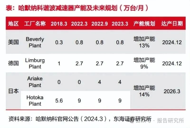 哈默纳科谐波减速器扩产幅度较小,不能覆盖人形机器人量产需求。根据哈默纳科财报,截止 2024 年 3 月,哈默纳科谐波减速器产能为 306 万台/年。公司为应对下游人形机器人和工业机器人需求规划扩 产,预计 2026 年哈默纳科产能将达 347 万台/年,整体扩产偏谨慎幅度较小,未能覆盖全球人形机器人 量产增长需求。