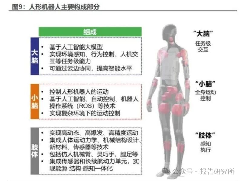 人形机器人主要构成部分包含由“大脑”、“小脑”和“本体”。其中,“大脑”负责实现环境感知、行为控制、 人机交互等任务级能力,目前主要是基于人工智能大模型技术,同时也可通过云边协同,提高机器人的 智能水平。“小脑”负责控制人形机器人的运动,目前主要基于人工智能、自动控制、机器人操作系统等 技术,实现复杂环境下的运动控制。“本体”负责实现高动态、高爆发、高精度运动,集成了人体运动力 学、机械结构设计、新材料、传感器等诸多技术,包括仿人机械臂、灵巧手、腿足等关键结构,并通过 集成传感器和长续航动力单元,实现能源-结构感知一体化。