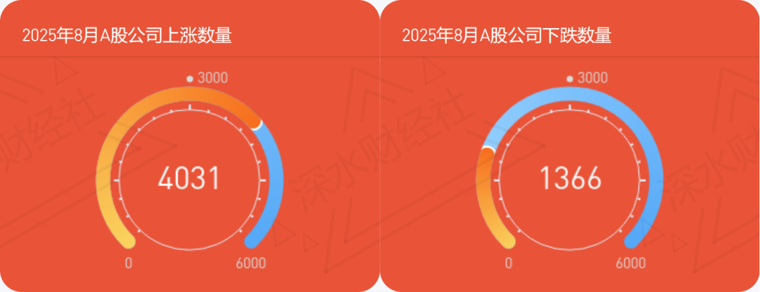 8月,A股有4031只股票收涨,另有1366只股票收跌。其中,江苏有529只股票收涨,178只股票收跌。