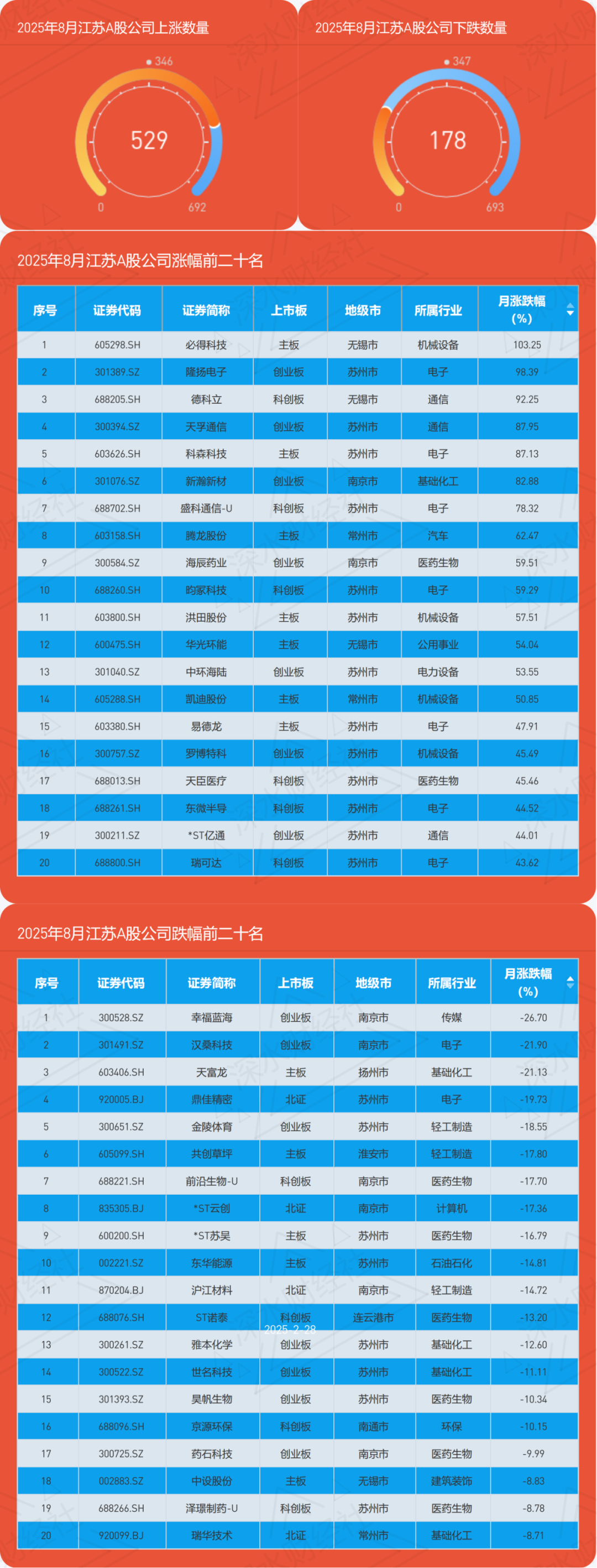 8月,江苏A股公司涨幅第一名是来自无锡的必得科技,月涨幅高达103.25%。