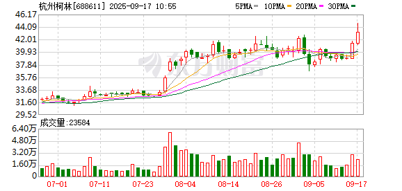 杭州柯林股价创出历史新高,截至9:45,该股上涨7.76%,股价报44.57元,成交量90.41万股,成交金额3872.36万元,换手率0.59%,该股最新A股总市值达68.37亿元,该股A股流通市值68.37亿元。