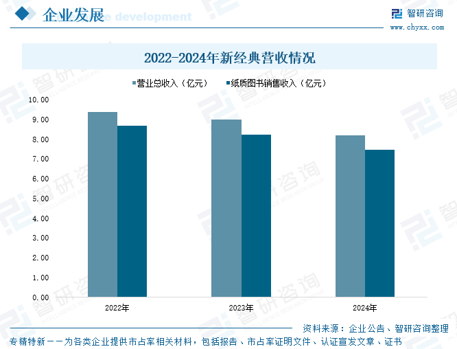 新经典文化股份有限公司成立于2009年8月13日,于2017年4月25日在上海证券交易所正式挂牌上市,股票简称“新经典”。新经典是以创新驱动的内容行业领先者,主要业务包括图书策划与发行、数字图书、图书零售,以及影视剧策划等版权延伸业务。在图书策划与发行方面,新经典是中国领先的图书策划与发行机构,已推出《窗边的小豆豆》《平凡的世界》《可爱的鼠小弟》《百年孤独》《活着》《解忧杂货店》《1Q84》《撒哈拉的故事》《倾城之恋》等4000多部作品,连续八年位居中国最大网络书店当当网年度供应商实销排名第一。数据显示,2024年,新经典营业总收入为8.21亿元,同比下降8.89%;其中,纸质图书销售收入为7.46亿元,同比下降9.56%。