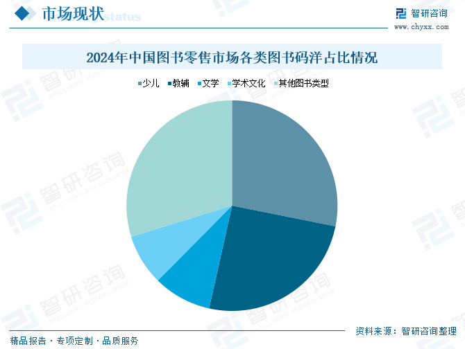 从各类图书的码洋构成来看,目前少儿类仍是码洋比重最大的类别,2024年占比达28.16%;其次是教辅类,码洋比重为25.33%。主要原因在于,少儿、教辅类图书面向的是中小学生这一庞大的用户群体,据统计,2024年我国小学、初中、高中在校人数分别为1.06亿人、0.54亿人、0.29亿人,教育需要持续为国内图书零售市场发展提供支持。