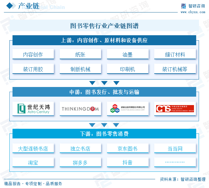 图书零售行业产业链上游为内容创作,以及原材料和设备供应环节,其中,内容创作是图书内容的源头,主要依靠小说家、学者、专家、自由撰稿人等内容创作者提供;纸张、油墨、缝订材料、装饰用箔片、装订用胶、制版机械、印刷机、装订机械等生产供应商则负责为中游的图书印刷发行提供原料及设备。产业链中游为图书发行、批发与运输环节,即图书批发商从出版社大量采购图书,然后通过自有运输或物流运输平台将图书分销至各地零售商。产业链下游为图书零售消费环节,即通过大型连锁书店、独立书店、京东图书、当当网、淘宝、拼多多、抖音等线下线上渠道将图书销售给读者。