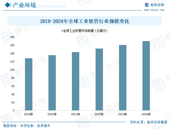 橡胶软管产品具备易收卷、贮藏运输体积小等优势,随着行业成型工艺的成熟和新型材料的使用,产品性能也呈现多样化趋势,其下游应用领域不断拓宽,目前已是应用最广泛的橡胶制品之一。从工业领域看,近年来,在国内工业加速发展,以及农业现代化趋势日益推进的发展背景下,工业软管市场应用需求不断增长,促使橡胶软管市场空间持续扩容。数据显示,2024年全球工业软管市场规模已从2019年的128亿美元增长至170亿美元,为橡胶软管行业提供广阔市场空间。