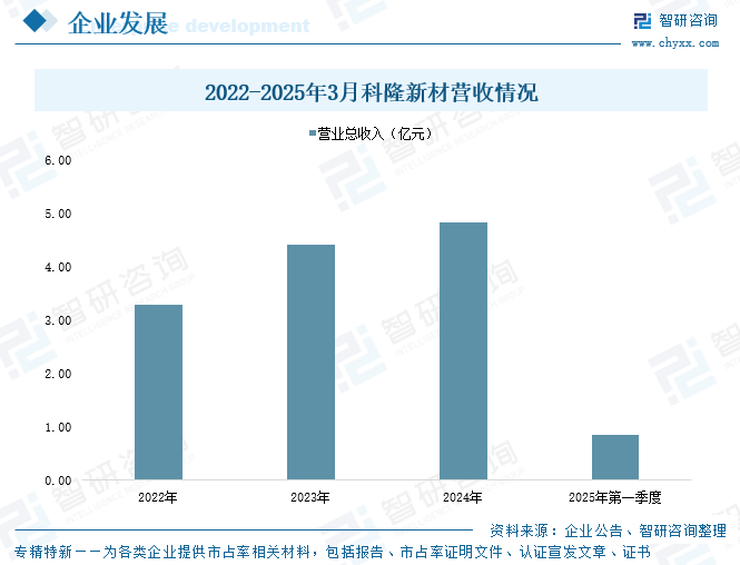陕西科隆新材料科技股份有限公司前身是咸阳科隆橡胶制品研究所,成立于1996年,于2024年12月5日在北交所成功上市,股票简称“科隆新材”。科隆新材以液压密封件和液压软管等橡塑新材料产品业务起家,目前主营业务为液压组合密封件和液压软管等橡塑新材料产品的研发、生产和销售,以及煤矿辅助运输设备的整车设计、生产、销售和维修。数据显示,2024年、2025年第一季度,科隆新材营业总收入分别为4.83亿元、0.84亿元,同比变化率分别为9.46%、7.43%。