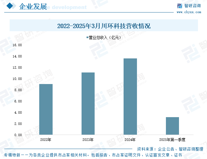 四川川环科技股份有限公司成立于2002年,于2016年9月30日在深圳证券交易所挂牌上市,股票简称“川环科技”。川环科技专注于研发、生产和销售车用胶管系列产品,核心业务是为各大汽车整车制造厂商提供配套汽车橡胶软管产品,产品范围涵盖燃油系统胶管、冷却系统胶管、制动系统胶管、动力转向胶管、车身附件系统胶管、进排气系统胶管。数据显示,2024年、2025年第一季度,川环科技营业总收入分别为13.63亿元、3.16亿元,同比变化率分别为22.88%、5.6%。