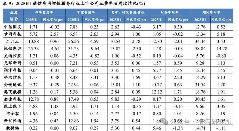 从期间费用率角度看,除恒信东方、吴通控股和数据港期间费用率分别同比减少 14.28、0.80 和 1.11 个百分点外,其余通信应用增值服务行业上市公司期间费用率均有所增加。