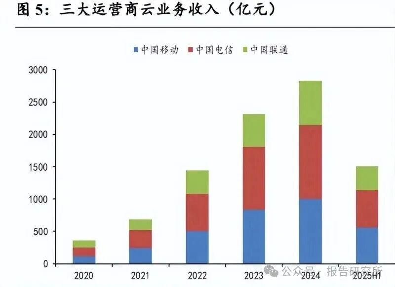 云业务收入持续提升,资本开支有所缩减。近年来,三大运营商云业务收入持续提升,2025 年上半年,三大运营商云业务收入合计达1510亿元。中国移动云收入为 561 亿元,同比增长11.3%;中国电信云收入为573亿元,同比增长 3.8%;中国联通云收入为376 亿元,同比增长18.61%。从资本开支角度来看,三大运营商纷纷开始缩减资本开支,中国移动2024年资本开支为 1640 亿元,同比下滑 9.04%;中国电信2024 年资本开支为935 亿元,同比下滑 5.35%;中国联通2024 年资本开支为614亿元,同比下滑 16.96%。2025 年三大运营商计划的资本开支合计为2898亿元,同比下滑 9.12%。
