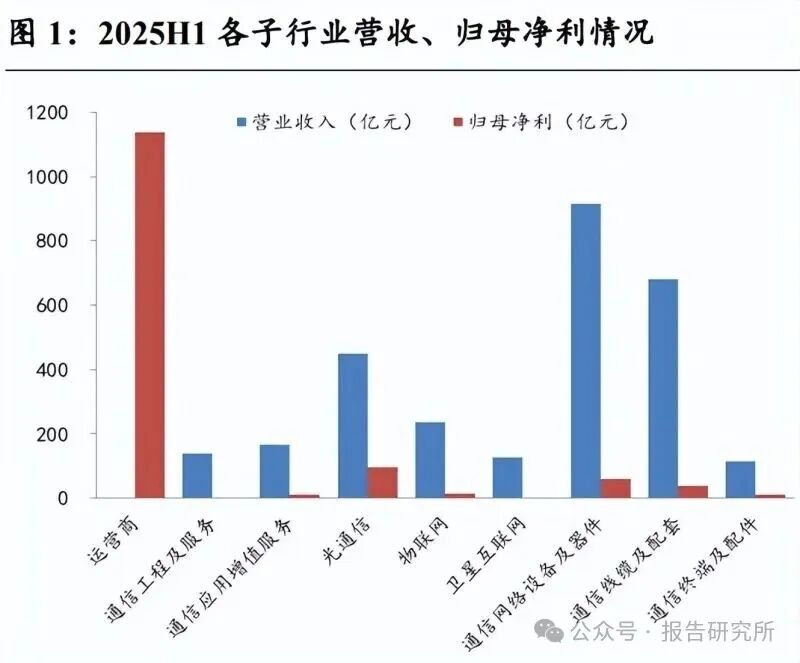 2025 年上半年我们跟踪的 92 家通信行业上市公司合计实现营业收入12959.45 亿元,同比增长 3.16%;实现归母净利合计1372.77亿元,同比增长 7.79%;行业毛利率为 29.46%,同比提升0.07 个百分点;净利率为10.59%,同比提升 0.45 个百分点。细分子行业来看,运营商、通信工程及服务、光通信、物联网、通信网络设备及器件和通信线缆及配套行业营业收入实现同比增长,分别同比增长 0.33%、4.25%、33.44%、26.75%、16.27%和 16.14%;运营商、通信应用增值服务、光通信、物联网和通信线缆及配套行业归母净利实现增长,分别同比增长5.14%、24.23%、124.91%、17.12%和 8.46%。 从盈利水平来看,2025 年上半年,运营商、通信应用增值服务、光通信和卫星互联网行业毛利率同比实现增长,分别同比提升0.59、1.47、6.98和 0.34 个百分点;此外,净利率同比提升的有运营商和光通信行业,分别同比提升 0.51 和 8.75 个百分点。