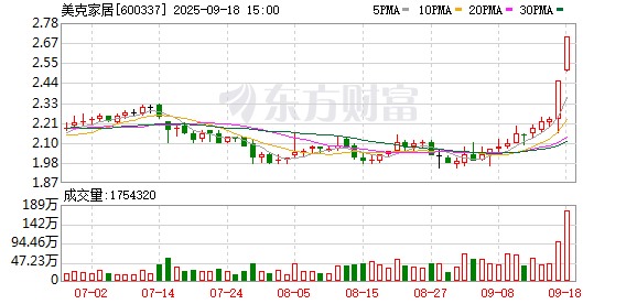 美克家居(600337)今日涨停,全天换手率12.21%,成交额4.63亿元,振幅8.00%。龙虎榜数据显示,营业部席位合计净买入1542.44万元。